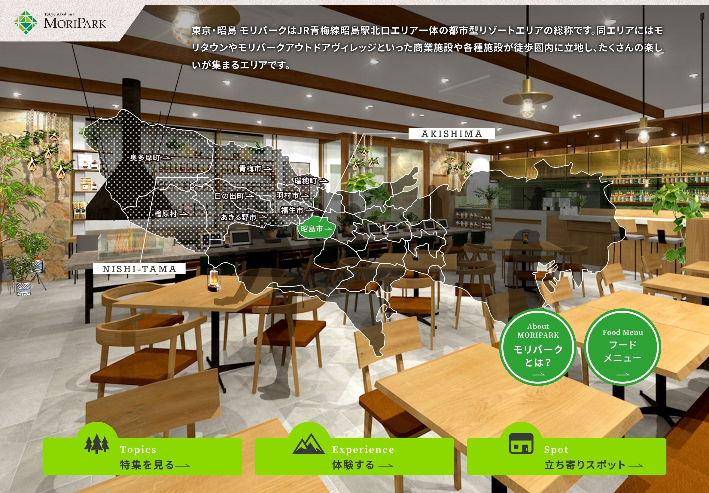 ドリンクは100%深層地下水「昭島の水」を使用。お食事は、フォレスト・イン 昭和館のシェフが腕を振るい、多摩エリア産の季節の野菜を取り入れたバラエティ豊富なメニューを提供いたします。昭島にお住いの方やお勤めの方、ショッピングに来られた方の憩いの場に加え、店内に設置されたタブレット端末で、モリパークや西多摩エリアの観光、アクティビティ、食に関する情報等、地域の魅力を発見する場としてもご利用いただけます。