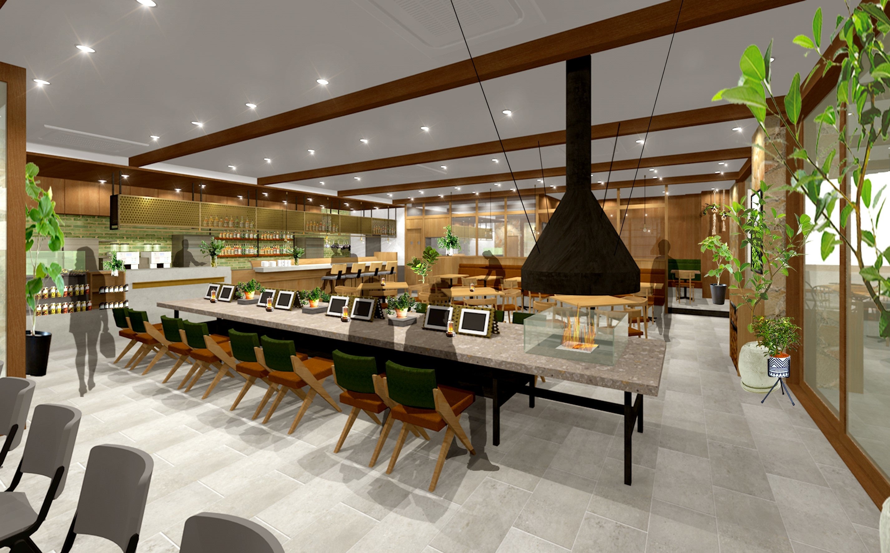 昭島で暮らす人、働く人、訪れる人に向けて、多摩エリアの魅力を発信し、長く親しまれるような素材を活かした質感で構成された店内には、暖炉を囲む席を含め60席用意し、テラス席には58席用意しています。またテラス席にはペット用のリードフックも設け、お散歩中でも気軽にお立寄りいただけます。
