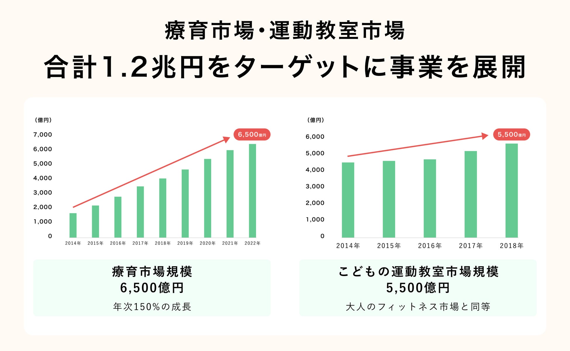 また、我々が対峙する療育領域の市場規模は、子どもの人数が減っているにも拘らず、年次150%の伸びで約6,500億円、子ども運動教室の市場規模も、大人フィットネス市場とほぼ等しい5,500億円と言われており、合算すると1.2兆円の市場規模があります(注1)。需要が大きくなっている中、暮らす場所問わず、専門的で質の高い支援を我々が届けていく必要があると感じています。