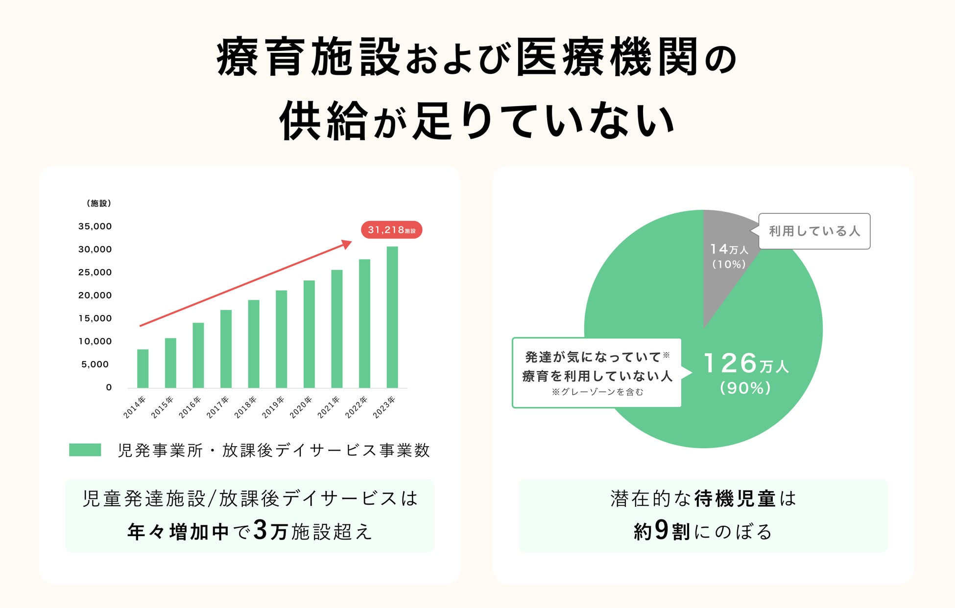 発達が気になる子どもは、日本全国の幼児と小学生で全体の10%となる約90万人 / グレーゾーンを含めると約140万人いるとも言われており、この10年で世界的にも急激に増加しています。発達に関する指摘を受けると、療育と言われる福祉施設や医療機関でのリハビリを勧められます。療育施設の数は、3万施設超と年々増加していますが、必要な支援の供給が追いついておらず、エリアによっては数年待機することもあります。