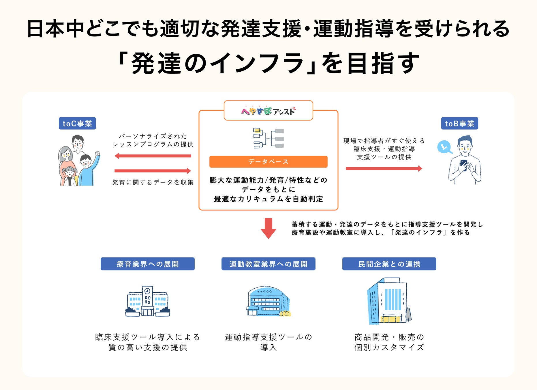 また、現在の「へやすぽアシスト」や、株式会社MIXIが提供する「家族アルバム みてね」との連携事業である「みてねおうち運動教室」の事業推進を通じて得られる子どもの発達・運動に関するデータは、他の事業者にない貴重なデータだと考えております。現在もオンラインによる専門的な発達支援の画期的な事例として、小児理学療法学会で発表するなど、お子さまが夢中になれる / 楽しく運動能力を向上させられるノウハウを数多く保有していますが、この先も症例を重ねることで、発達支援・運動指導の方法を確立し、それらを反映した指導支援ツールを開発していくことも考えています。それらを療育施設や運動教室に導入することで、日本中どこでも適切な発達支援・運動指導を受けられる「発達のインフラ」となることを目指して、より一層事業成長のスピードを早めていきます。