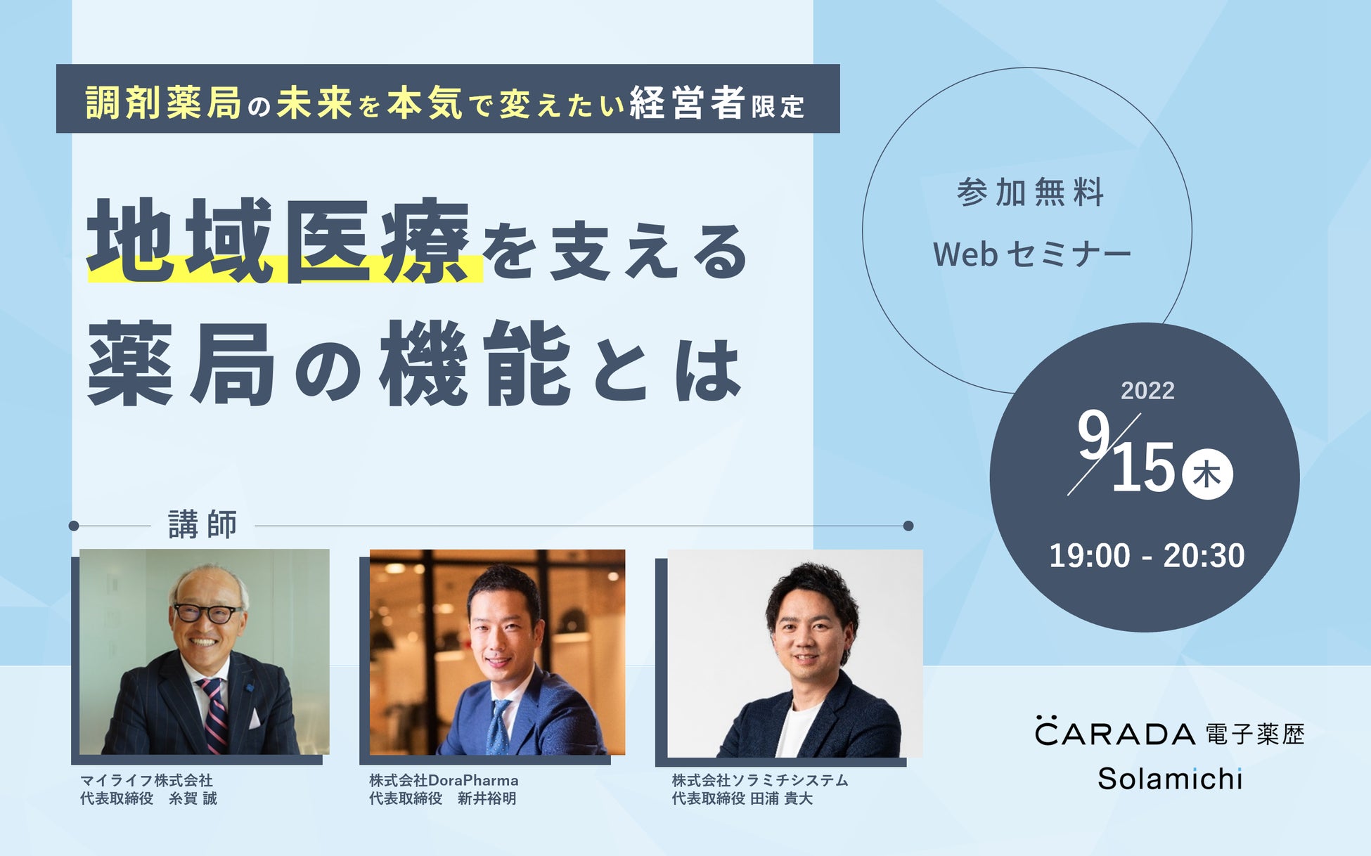 クラウド電子薬歴『CARADA 電子薬歴 Solamichi』の企画・開発・販売を行う株式会社ソラミチシステムは、薬局事業、医業経営コンサルティング事業を展開するマイライフ株式会社の代表取締役 糸賀誠氏と、薬局の新卒薬剤師採用に特化したコンサルティングを展開する株式会社DoraPharma 代表取締役 新井裕明氏をゲストに迎え、無料オンラインセミナー「調剤薬局の未来を本気で変えたい経営者限定 地域医療を支える薬局の機能とは」を2022年9月15日(木)19時より開催します。