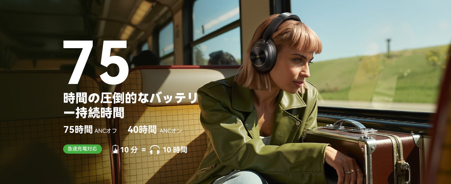 一度の充電で最大75時間(Bluetoothモード)、ANCオンでも40時間という長時間の連続再生が可能です。さらに、わずか10分の充電で約10時間の再生が可能な急速充電機能にも対応。旅行や長時間の移動、通勤、リモートワークなど、どんなに忙しい毎日でもバッテリー切れの心配なく、安心して一日中音楽を楽しむことができます。