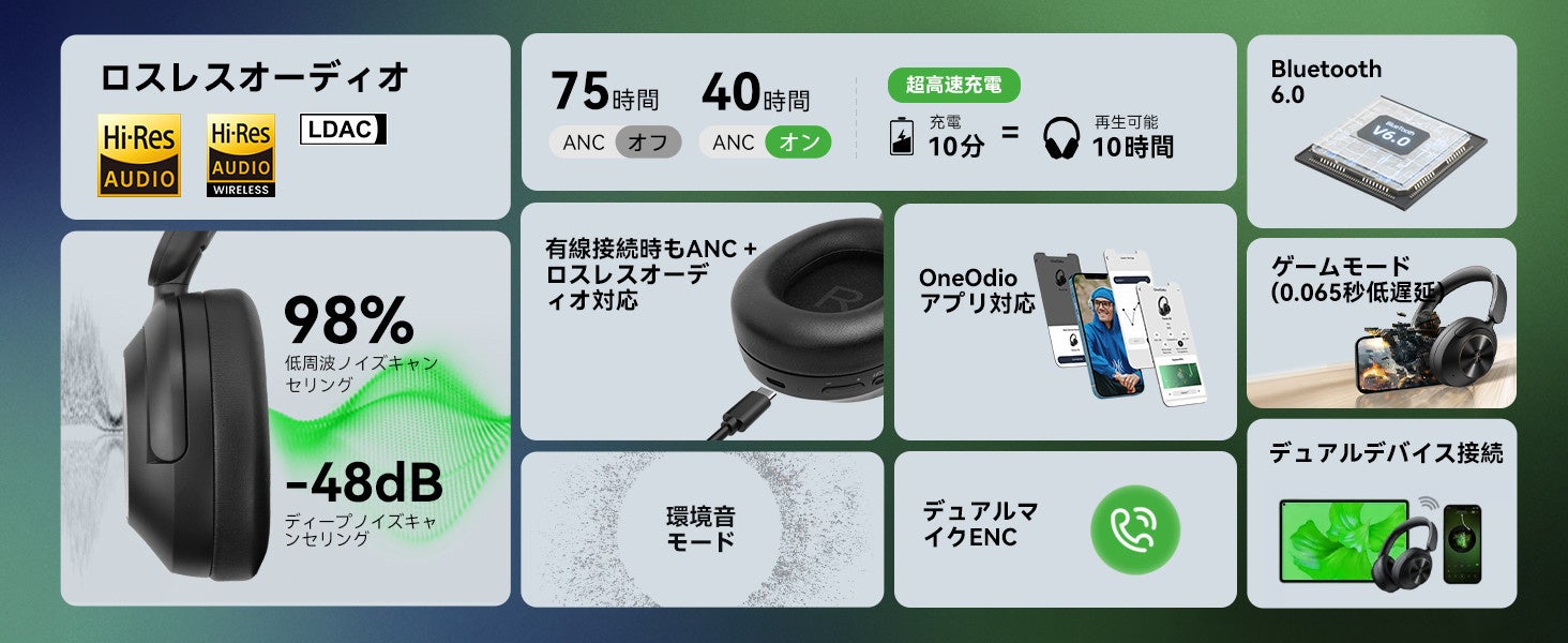OneOdioは音楽を愛する全ての人々に向けて、高音質なヘッドフォンとイヤホンを提供し続けているグローバルなオーディオブランドです。この度、OneOdioはハイブリッドノイズキャンセリングワイヤレスヘッドホン「OneOdio Focus A6」を発売することをお知らせいたします。本製品は、これまでのOneOdioの技術と経験を結集し、比類ない音質、業界最高クラスのノイズキャンセリング性能、そして長時間のバッテリー駆動を実現。あらゆるシーンで最高のリスニング体験を提供する、次世代のヘッドホンです。