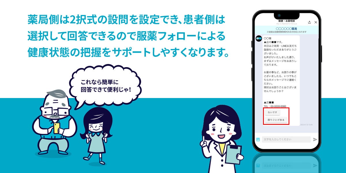2択式の設問を作成できます。ユーザーは、LINEに届いた質問と2択の回答から選んでタップするだけで、薬剤師に返信を送ることができます。