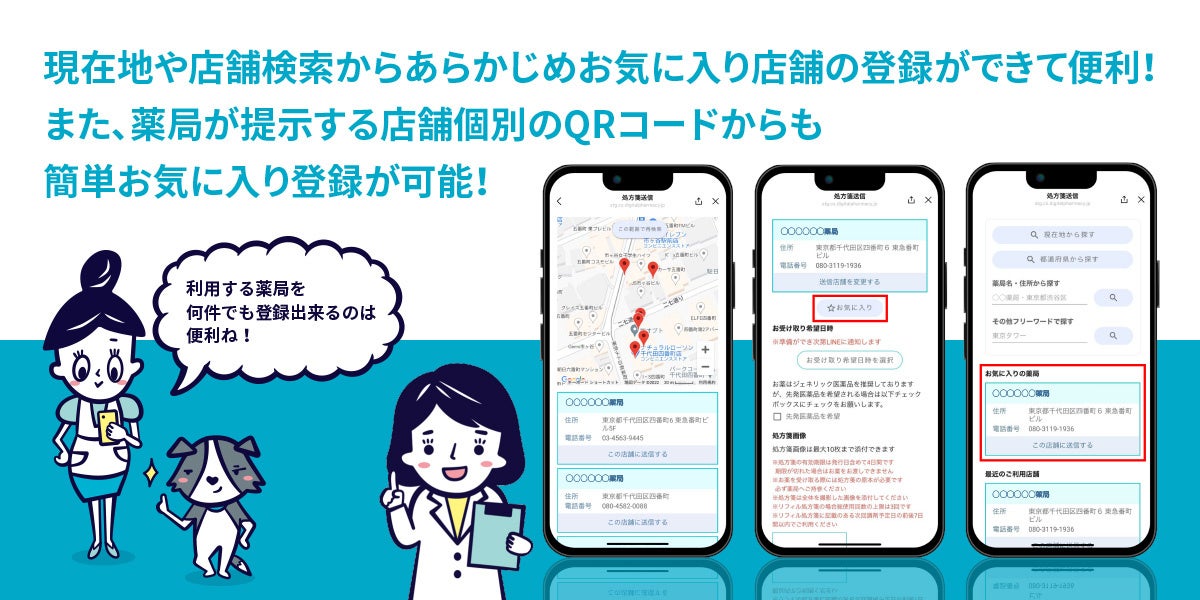 ユーザーが薬局に処方箋送信する際、店舗検索することなく、ご自身のかかりつけ薬局をすぐに選択できる「お気に入り登録」機能を追加しました。