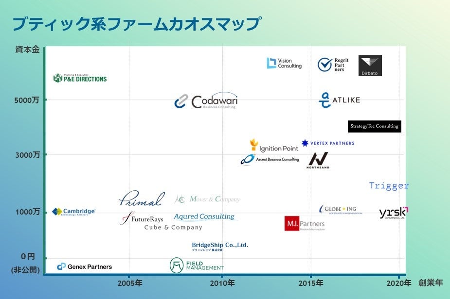 「ブティック系コンサルファームカオスマップ」は、代表的な24社のブティック系コンサルティングファームの創業年と資本金を軸に作成しました。