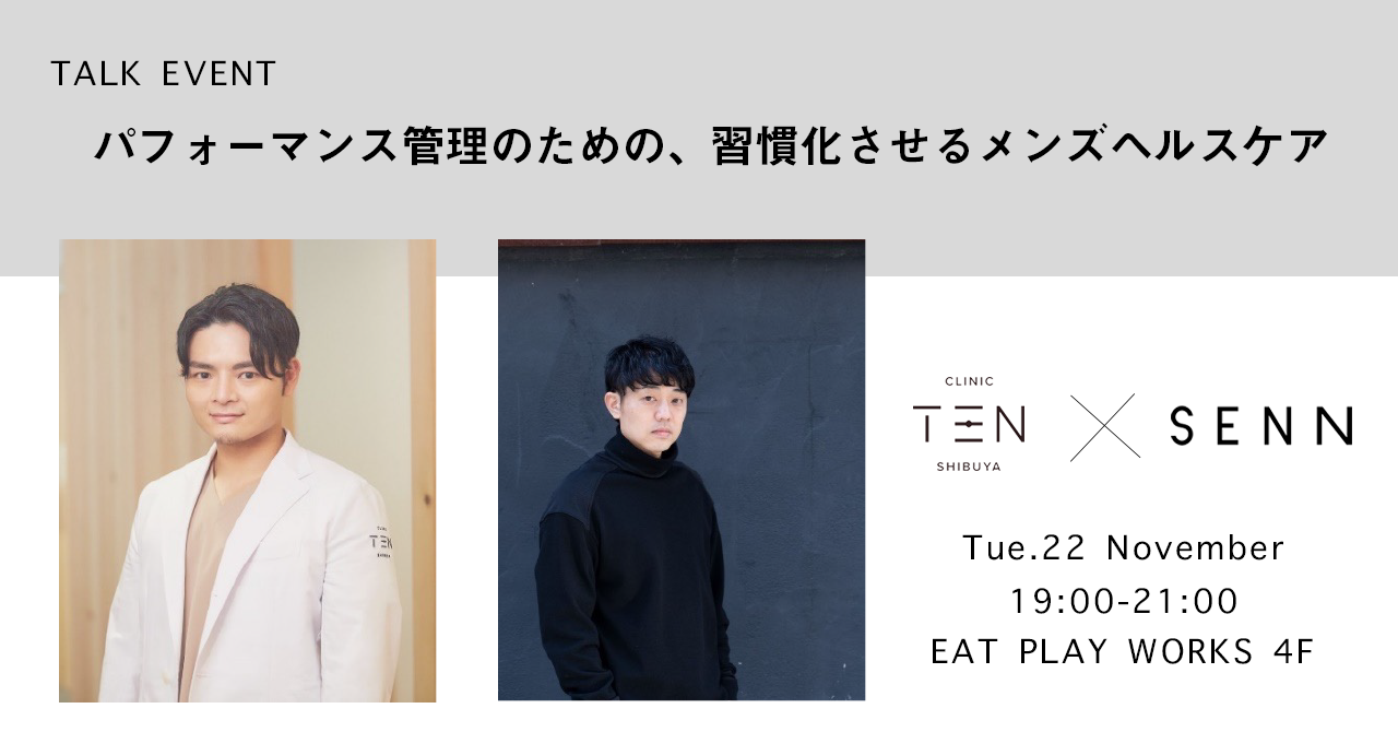 当日は、ライフスタイルブランド「SENN」を運営し“Less is beauty”の思想を広げる株式会社TO NINE 共同代表取締役COO 吉岡芳明氏を招き、クリニックTEN渋谷院長との対談形式にて、「パフォーマンス管理のための、習慣化させるメンズヘルスケア」をテーマにトークセッションを行います。