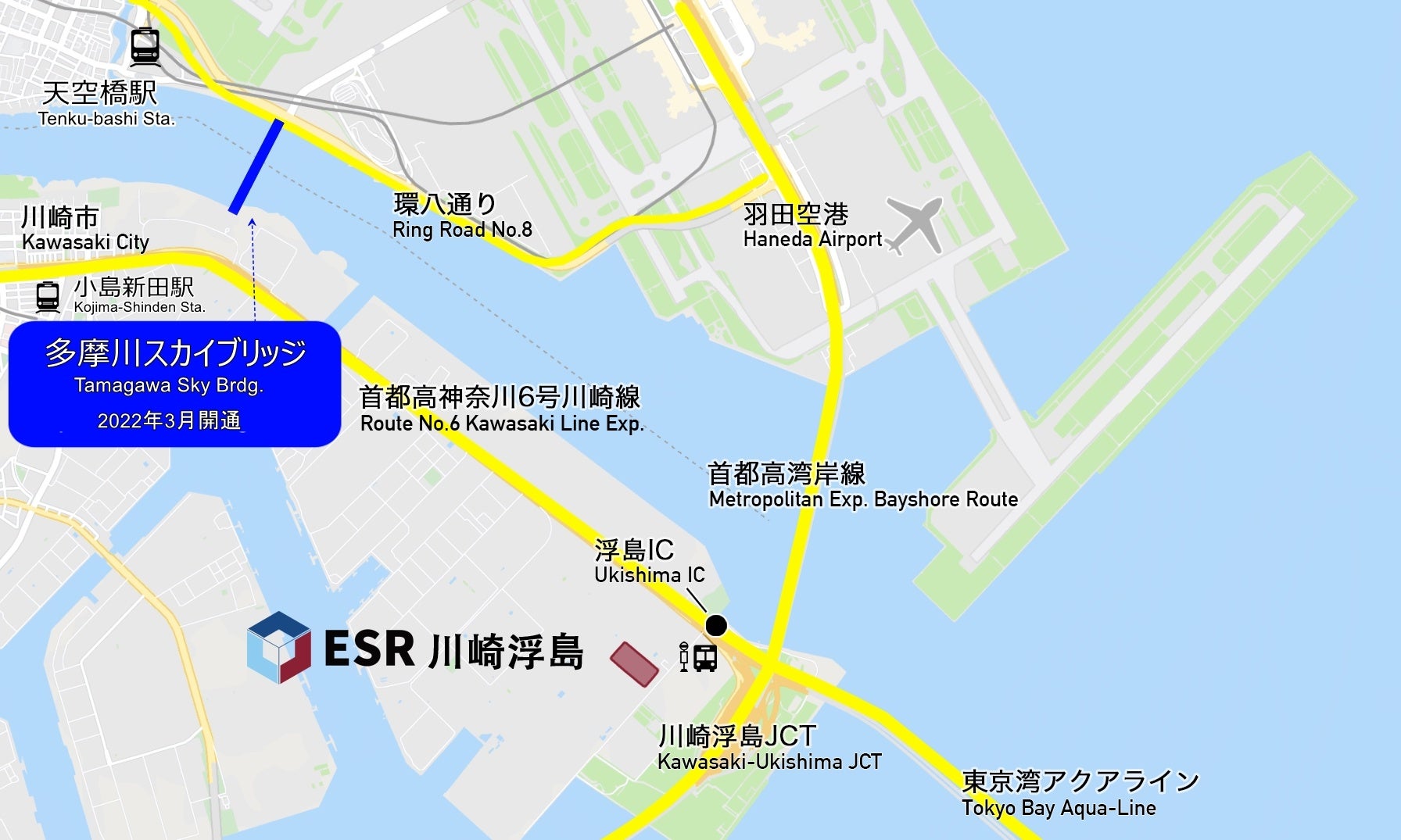 首都高速湾岸線・東京湾アクアライン「浮島 IC」より300mの至近距離にあり、2022年3月に羽田空港と川崎臨海部(キングスカイフロント)を結ぶ「多摩川スカイブリッジ」が開通したことで、東京都心・羽田空港(7km・約10分)へのアクセスがさらに向上しました。また、川崎港コンテナターミナルより7.5km、横浜港大黒ふ頭より18km、東京湾大井コンテナふ頭より15kmという立地で、空輸貨物、海上貨物を効率的に保管できるため、輸出入貨物配送に優位性を確保しています。