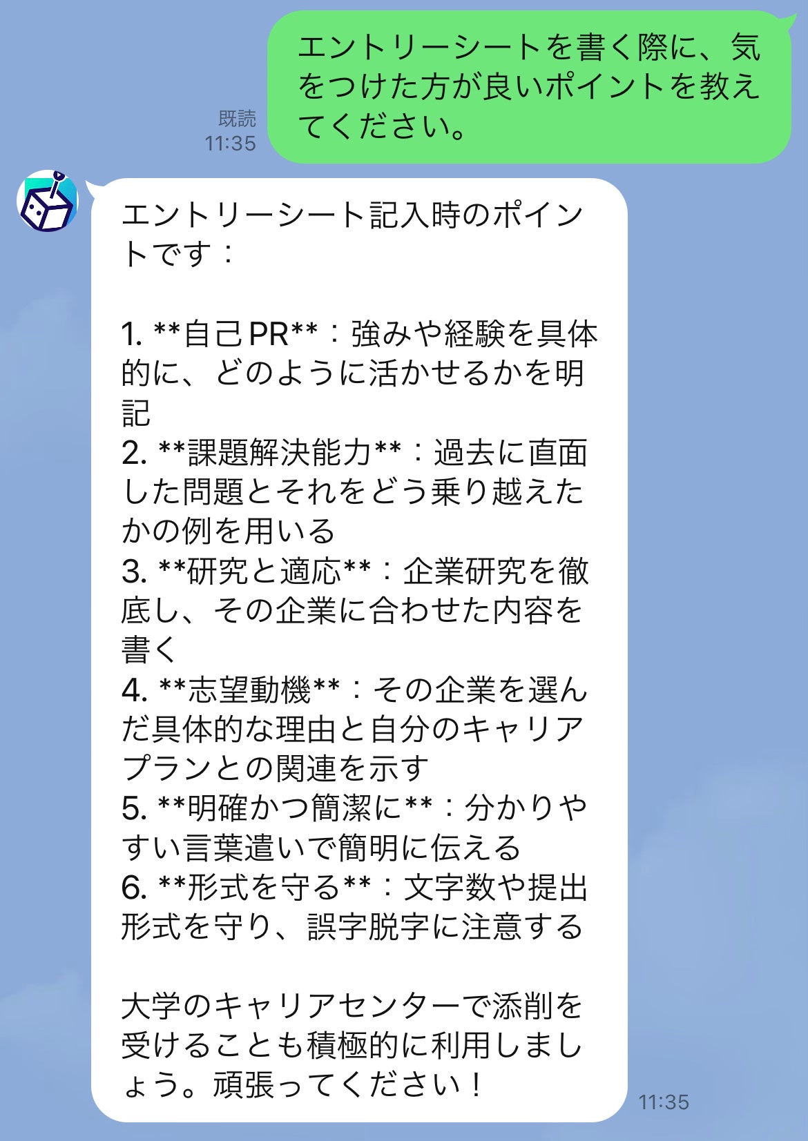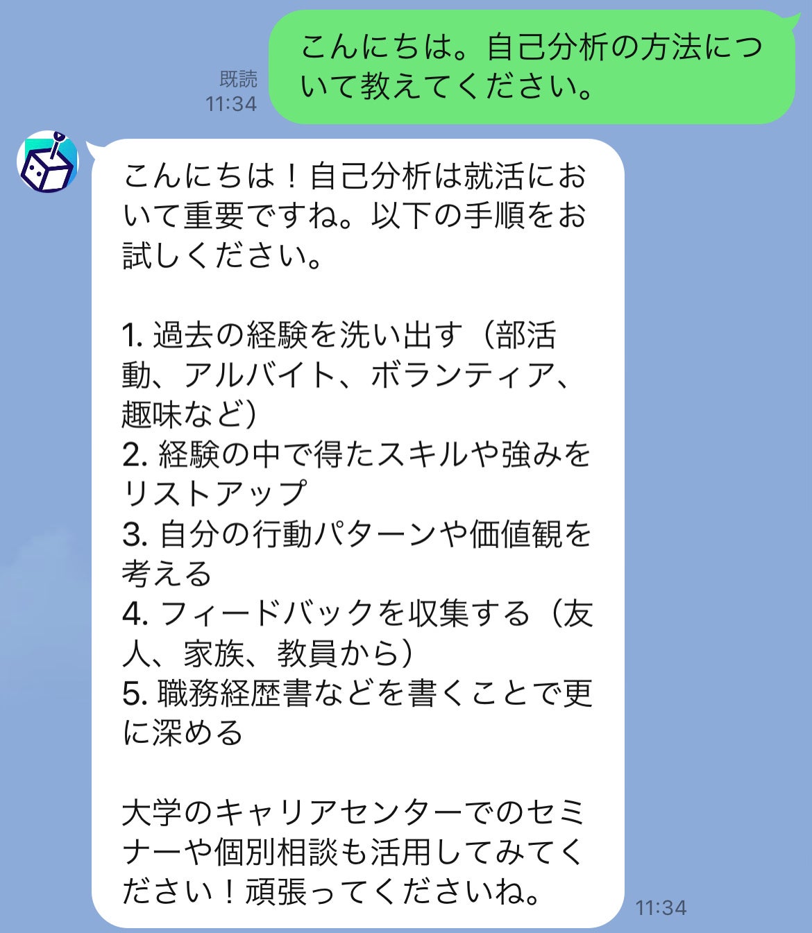 利用上の注意:当サービスは就活生を対象としております。就活生以外による利用や、質問の内容・回数に問題があると当社が判断した場合には、サービスの利用を停止させていただくことがございます。また、運営上の理由により、サービスを停止することがございます。