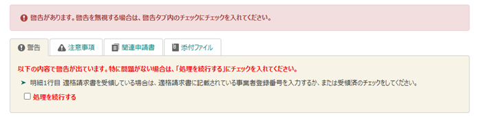 ※警告機能の利用は申請書の種類ごとに選択することができますので、請求書の支払申請ではチェックを行い、交通費精算書ではチェックをしないといった運用も可能です。