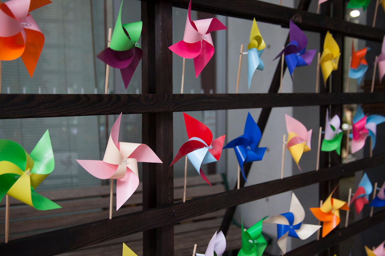 学生ボランティアがひとつひとつ手作りした色とりどりのかざぐるまが登場。キャンパスの風を受けて回ります。