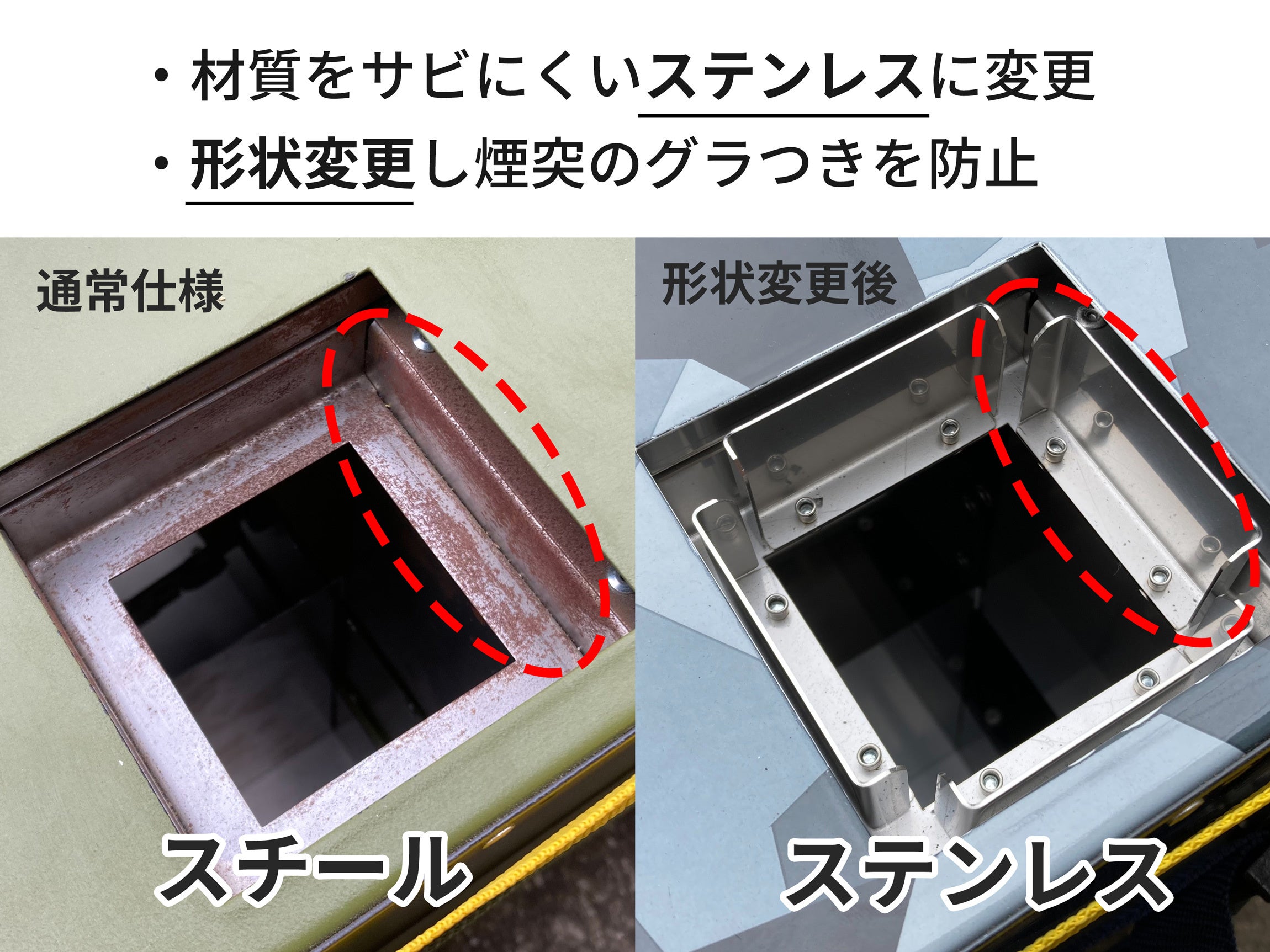 煙突の差し込み口も形状を変更し、しっかりと差し込めるようになりました。