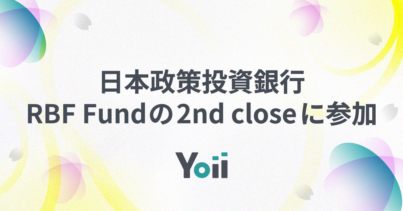 レベニュー・ベースド・ファイナンス(以下、RBF)プラットフォーム「Yoii Fuel(ヨイフューエル)」を運営する株式会社Yoii(ヨイ、本社:東京都、代表取締役CEO:宇野雅晴)は、当社が運営する「Yoii RBFファンド1号投資事業有限責任組合(以下、本ファンド)」の2nd closeとして、株式会社日本政策投資銀行(以下、DBJ)が本ファンド に参加したことをお知らせいたします。