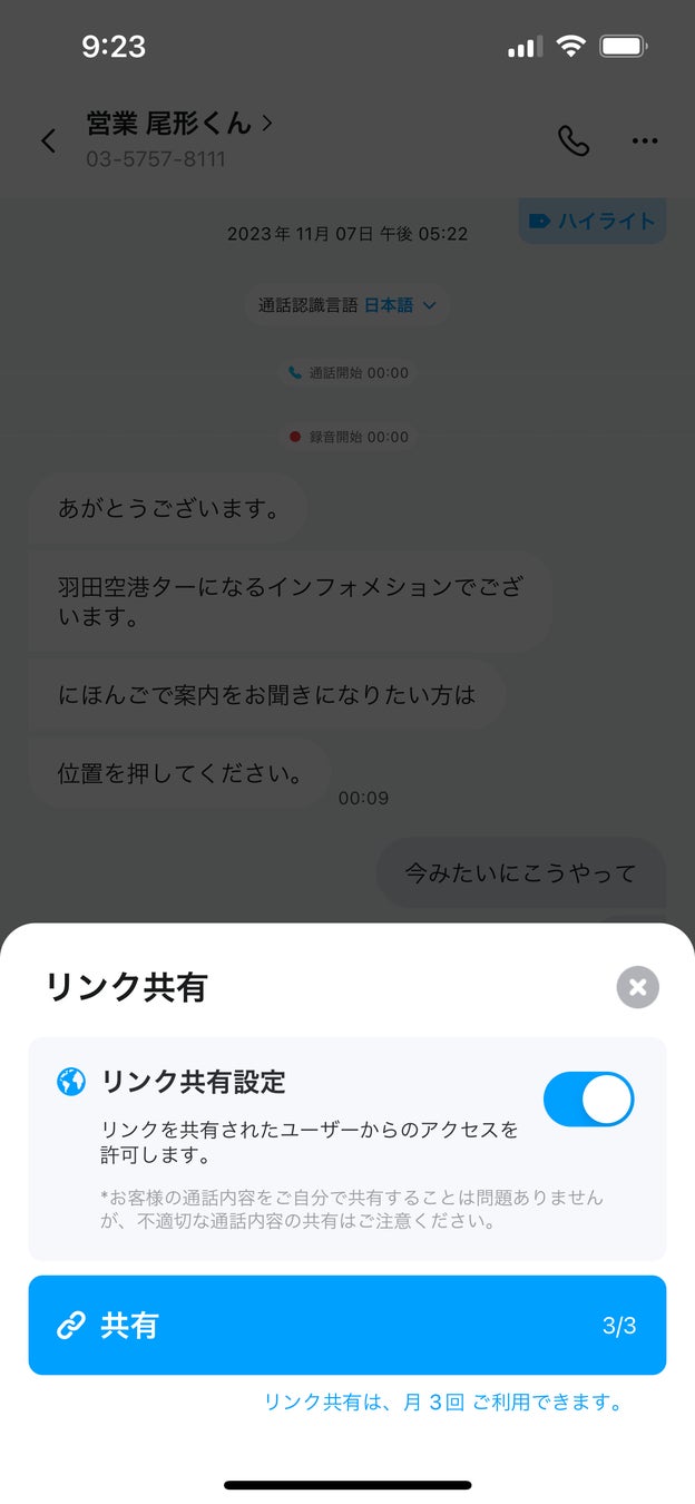 通話内容は自動的にチャット形式で表示され、該当コメントをタップすると音声が再生されすぐに確認できます。また、記録された通話録音内容及びテキストを簡単にリンクで共有も可能です。