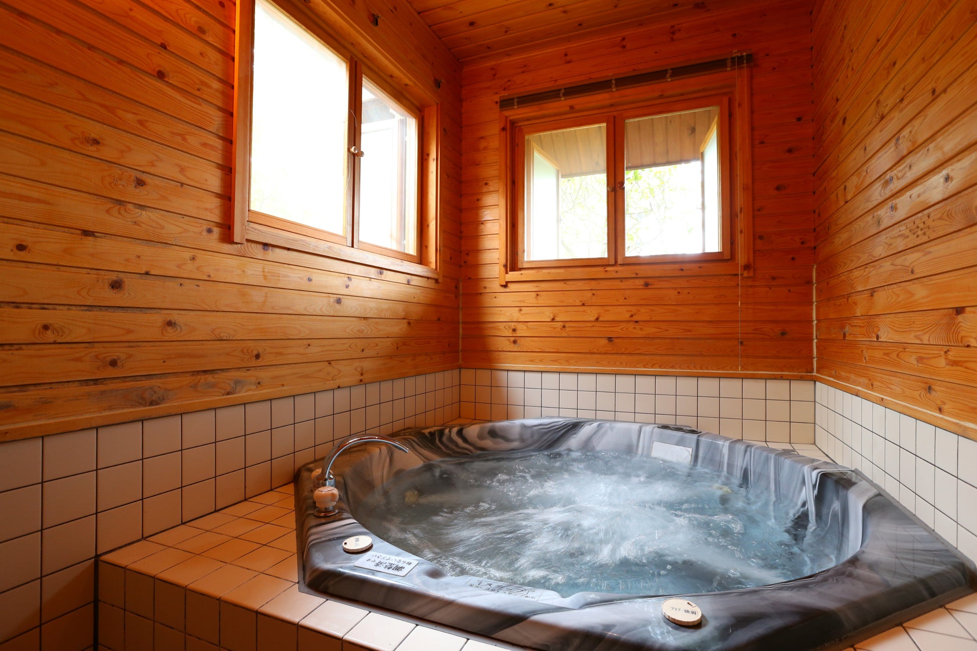 古泉閣本館の温泉もご利用いただけますが、コテージ内には大人4名が一緒に入れる