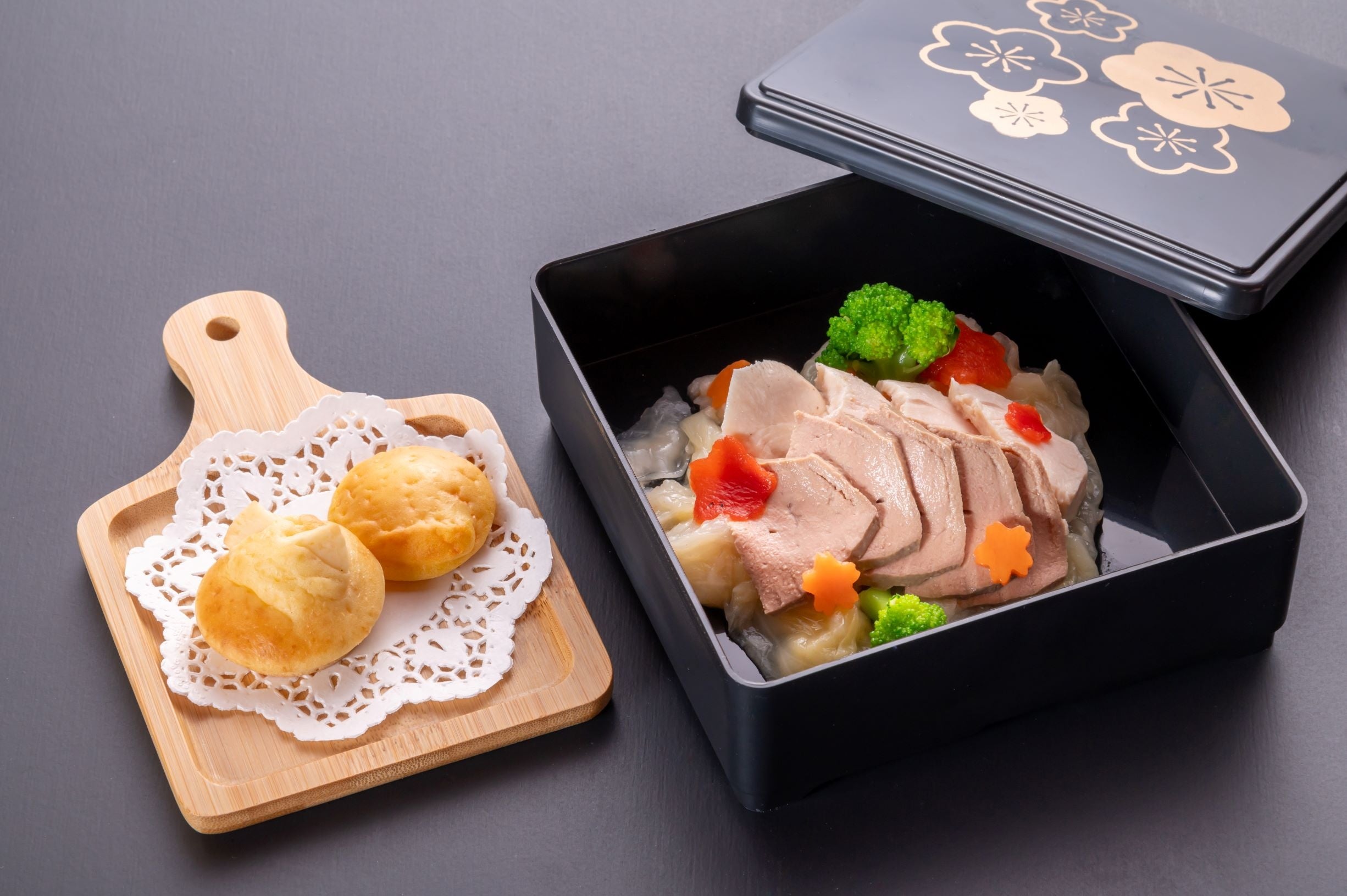 ご夕食は自慢のビフカツなどが入った彩り弁当、ご朝食は自家製パンと卵料理のボックスモーニングで、