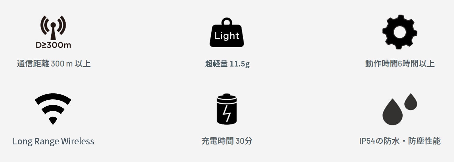 AERO-D-X1 はリモートID未搭載の様々な機体に搭載できる11.5gの小型軽量サイズに、30分でフル充電可能な急速充電に対応した6時間以上使用可能なリチウムバッテリーを内蔵。300メートル以上の通信距離や半径30メートルの測位精度、様々な気候に対応した動作環境と防水・防塵規格 IP54など外付型リモートIDに求められる機能を持ちながら、大幅なコストカットを実現しました。これまで費用の問題でリモートID未搭載のドローンや無人航空機の活用や導入を見送られていたユーザーや事業者に、安全で現実的な空の世界をお届けします。