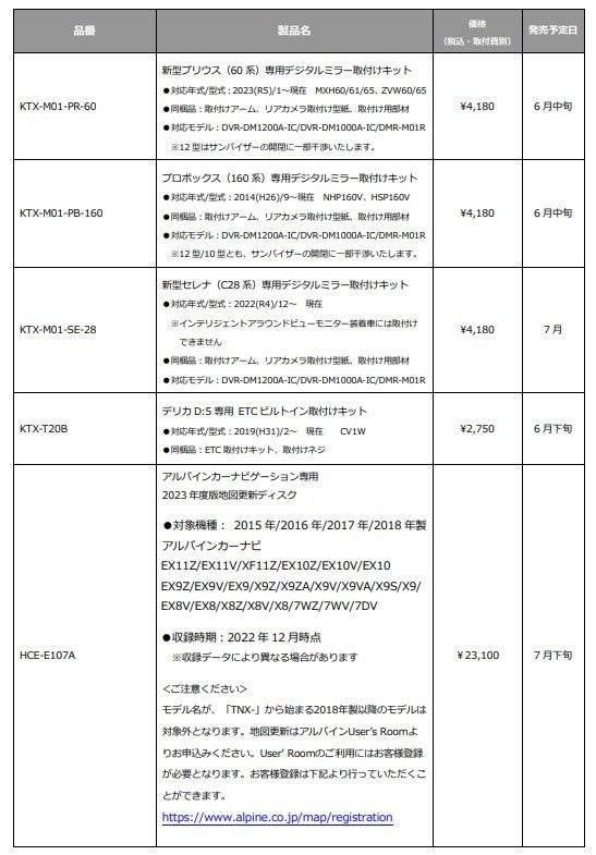 電子部品、カーエレクトロニクス関連製品の開発・製造・販売を行うアルプスアルパイン株式会社(東京都大田区、栗山 年弘社長)の国内マーケティング部門であるアルパインマーケティング株式会社(東京都大田区、石田 宗樹社長)は、最大12型の大画面で後方を高精細に映し出すドライブレコーダー搭載デジタルミラー関連の新製品として、トヨタ・新型プリウス、プロボックス、日産・新型セレナ専用の取付けキットを発表。2023年6月下旬より全国のアルパイン製品取扱店にて販売を開始いたします。また、2023年度版地図更新ディスクも7月下旬より販売を開始いたします。