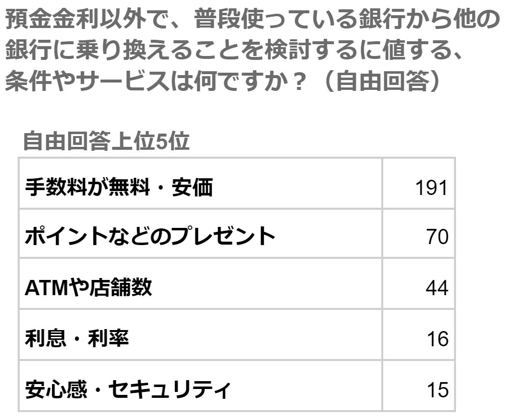 ・一方で銀行乗り換えを検討する際に重視することの1位は「手数料」