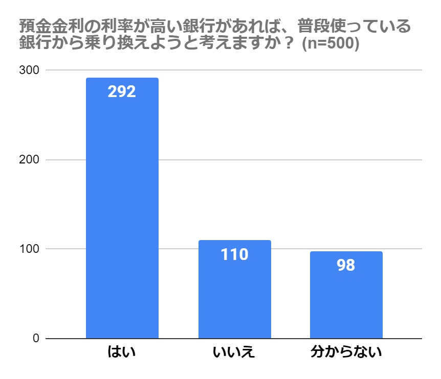 回答者の約半数が、銀行預金の利率が高ければ普段使う銀行からのり換えを検討