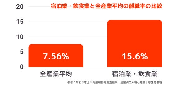 厚生労働省が発表した資料によると、2021年上半期の国内全産業の中で「宿泊業・飲食業」の離職率は15.6%と最も高く、全産業平均の離職率7.56%と比べ、2倍以上となっています。このデータからも宿泊業における人手不足の深刻さがわかります。