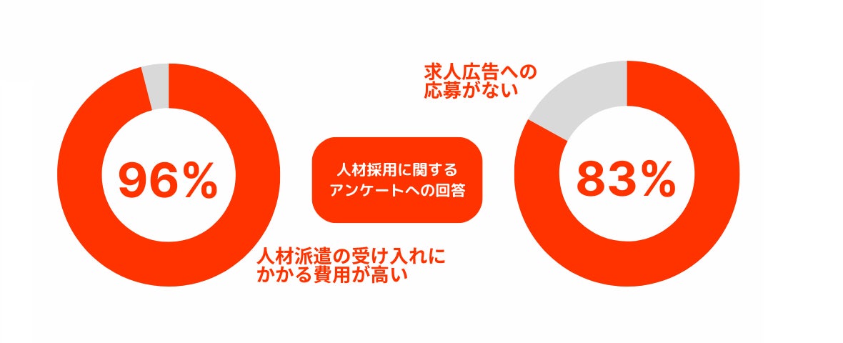 アンケートの結果、「人材採用に関する課題」として、「人材派遣の受け入れにかかる費用が高い」が96%、「求人広告への応募がない」が83%と、この2つが上位を占めていることが明らかになりました。