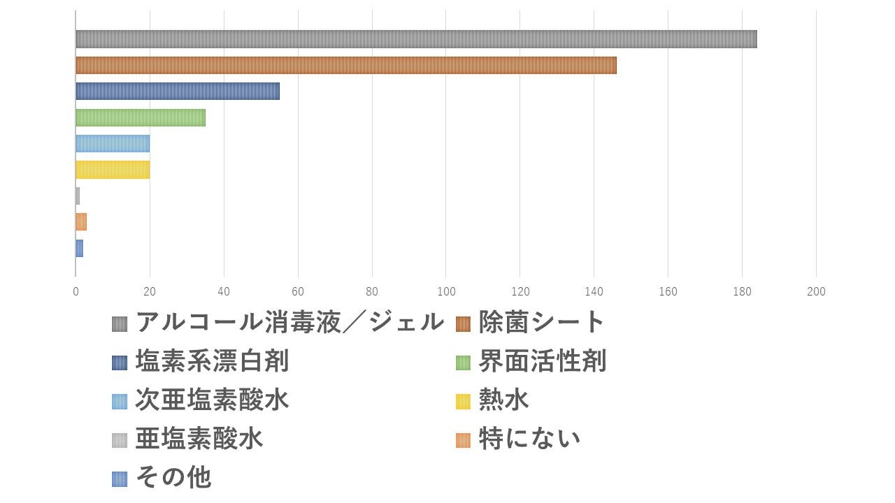 次に塩素系漂白剤、界面活性剤と続き、ドラッグストアなどでも手に入る、比較的手軽かつ除菌効果の高いものが好んで使用されやすい傾向にあるようです。