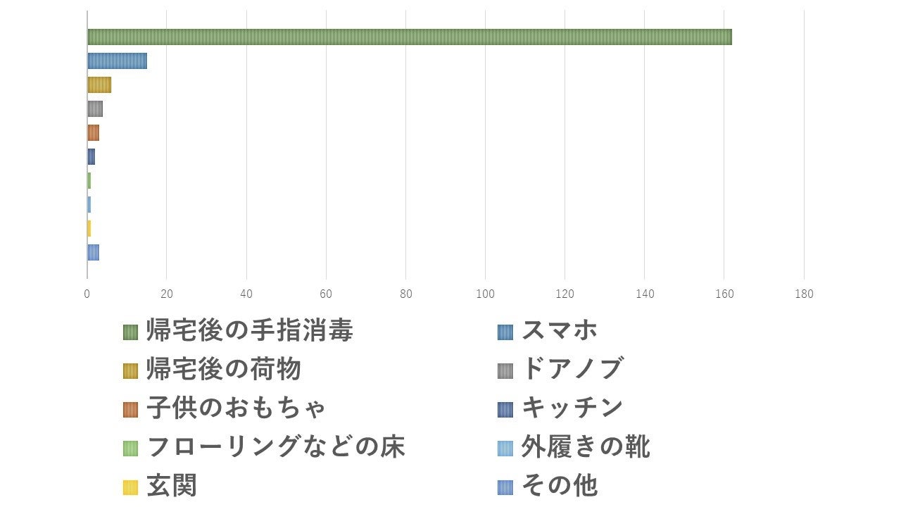 次にスマホ、帰宅後の荷物と自宅内にあるものというよりも、外の空気に触れるものに対して特にウイルスの脅威を感じる人が多いことが感じ取れる結果となりました。