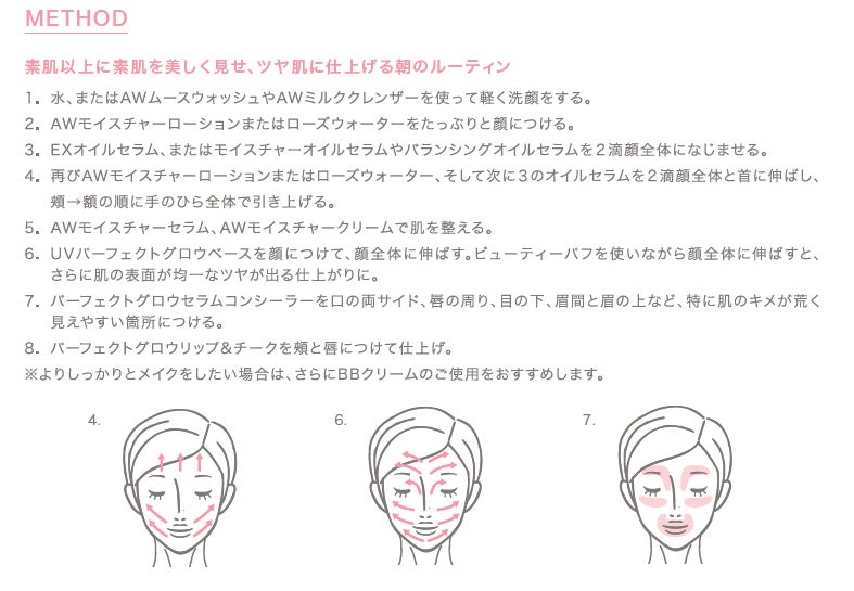 UV パーフェクトグロウ ベースに EX オイルセラムを1滴加えて手の平 でなじませ、乳液を塗るように顔全体になじませる。UV パーフェクト グロウ ライトベージュを顔の中心、赤みが気になる部分のみ塗る。 UV パーフェクトグロウ ミディアムベージュをビューティパフの側面で 頬骨の下とフェイスラインにコントゥア風にのせる。仕上げにハイライト として、UV パーフェクトグロウ ベースを鼻根、目頭、唇の山、目の 下のくぼみ、こめかみの 5 カ所にのせる。