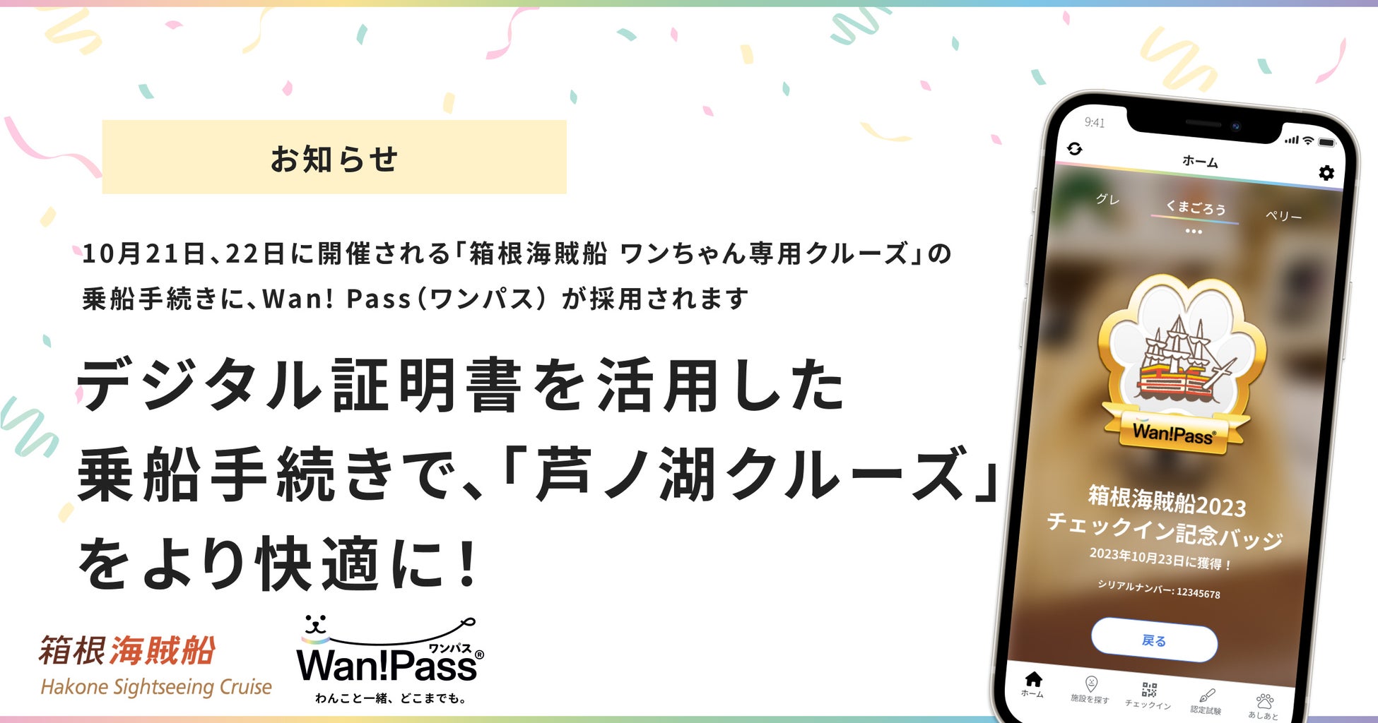 ペットとのお出かけを支援するアプリ「Wan!Pass(ワンパス)」を展開するペッツオーライ株式会社(本社:東京都中央区、代表取締役CEO:小早川斉、以下ペッツオーライ、https://petsallright.net/ )は、小田急グループの箱根観光船株式会社(本社:神奈川県小田原市、社長:長峯 昭彦)が運営する「箱根海賊船」(神奈川県箱根町)において、10月21日(土)22日(日)に開催される「ワンちゃん専用クルーズ」の乗船手続きに、Wan! Pass が引き続き採用されますことをお知らせいたします。