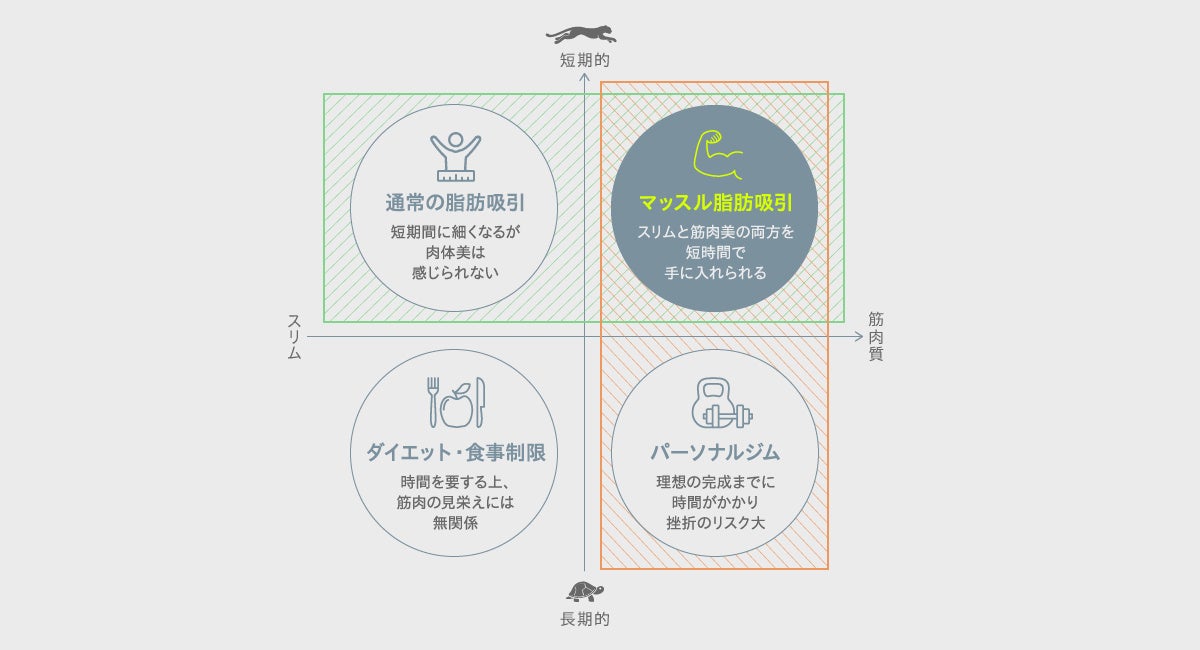 その点、マッスル脂肪吸引™️なら施術は1日で完了します。つまり、まず理想が手に入るわけです。その結果「これを維持したい」という意欲が生まれます。失いたくないという欲求が、結果的に理想の維持につながると考えられます。