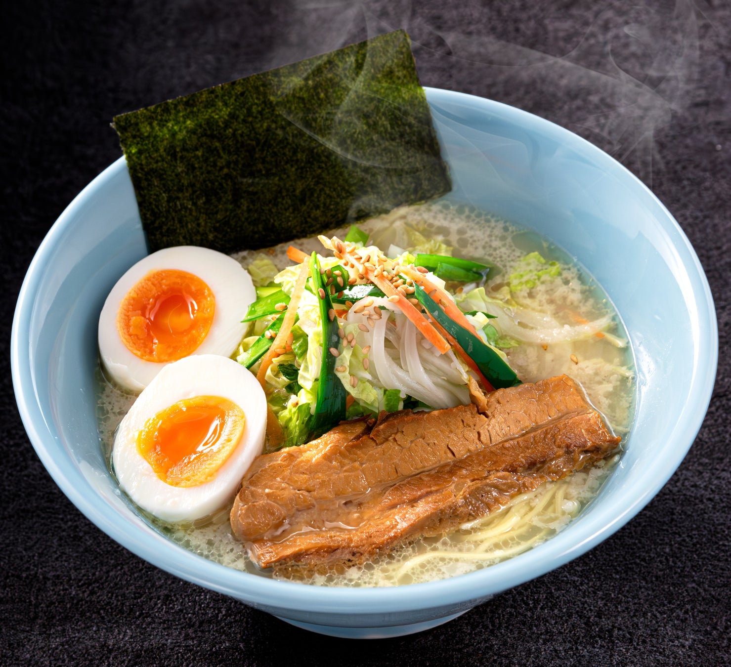 トッピングの主役は、「岩崎本舗」特製のトロトロ角煮チャーシューです。さらに味や食感のアクセントに白菜、ニラ、玉ねぎ、にんじん、海苔、半熟玉子をトッピング。
