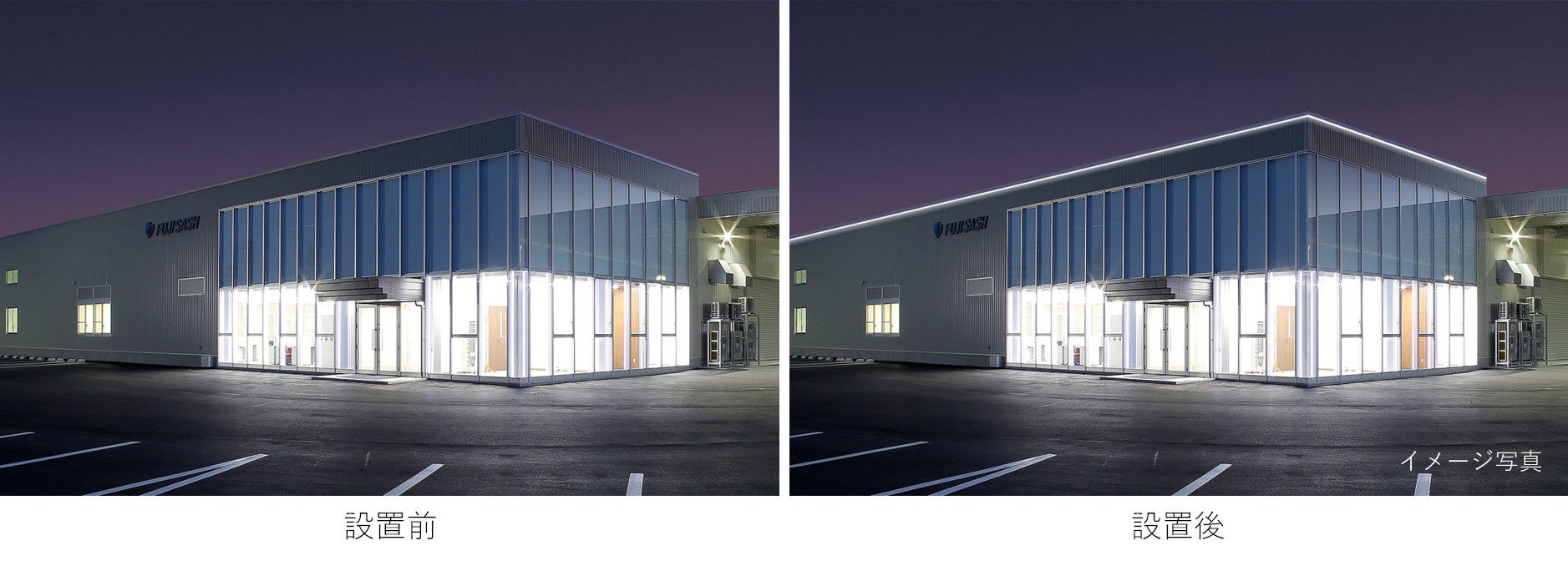 ライトコーピングシリーズのアルミ笠⽊にLED照明を内蔵し、光の意匠を加えた「LED笠⽊」を不⼆サッシ株式会社、ビニフレーム工業、株式会社遠藤照明の3社で共同開発。笠⽊に専⽤パーツでライン照明を下向きに内蔵することで、眩しさを感じさせず効果的に外壁を照らします。従来の笠⽊の機能はそのままに、建築物を光で縁取り、アイキャッチとしての役割を持たせることで、 「LED笠⽊」は夜間景観に新たな彩りを添えてくれます。