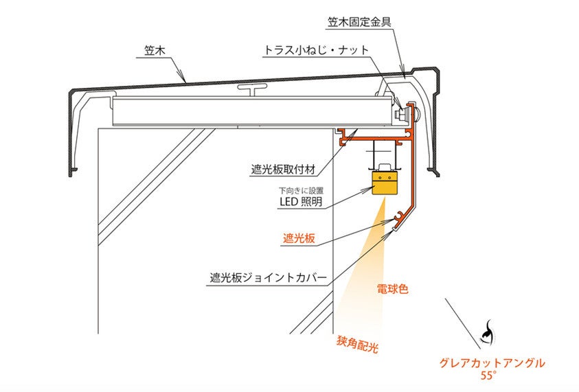 経緯とその成果:光害に配慮しながら良好な都市景観をつくるためには、空に向けての配光を避け、下向きの配光にする必要があった。 一方で、歩行者の視線を考えると下向きの光は眩しさに繋がるため、遮光板を設置した。 光害と眩しさの課題を解決しながら、最大の照明効果を得るために狭角配光を採用した。 遮光板は笠木本体と一体感を持たせ、テーパーをつけることで意匠性と遮光機能を両立させた。