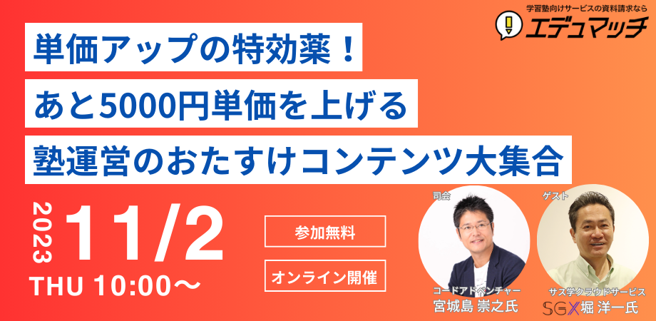【参加特典あり】単価アップの特効薬!単価を5000円上げる塾運営のお助けコンテンツ大集合|11/2(木)セミナー