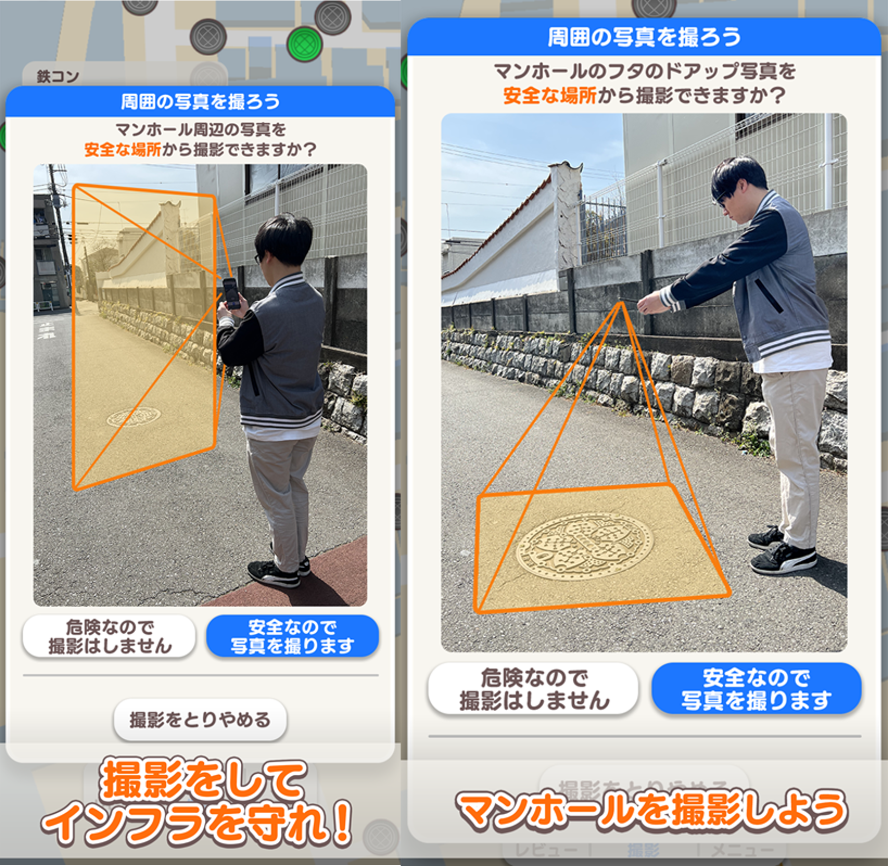 3)「鉄とコンクリートの守り人」アプリを使って、マンホールを撮影・投稿。