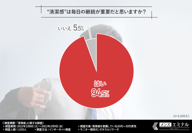 そこで今回、メンズ医療脱毛クリニック『メンズエミナル』(https://mens-eminal.jp/)は、清潔感を意識している20代〜30代男性を対象に、「清潔感」に関する調査を実施しました。
