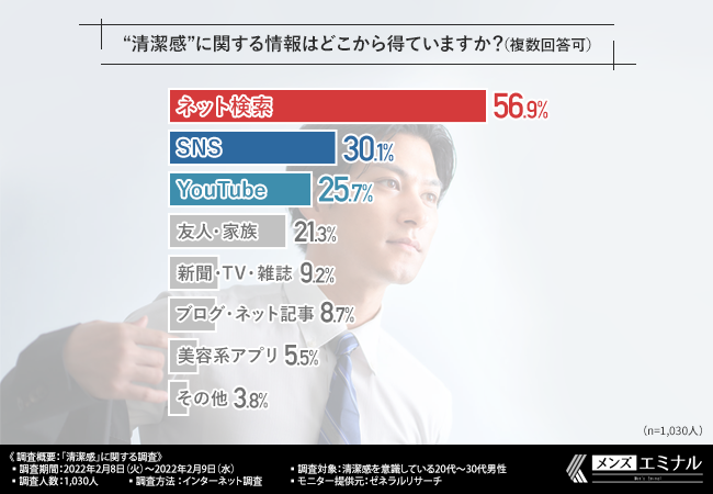 そこで、「“清潔感”に関する情報はどこから得ていますか?(複数回答可)」と質問したところ、『ネット検索(56.9%)』と回答した方が最も多く、次いで『SNS(30.1%)』『YouTube(25.7%)』と続きました。