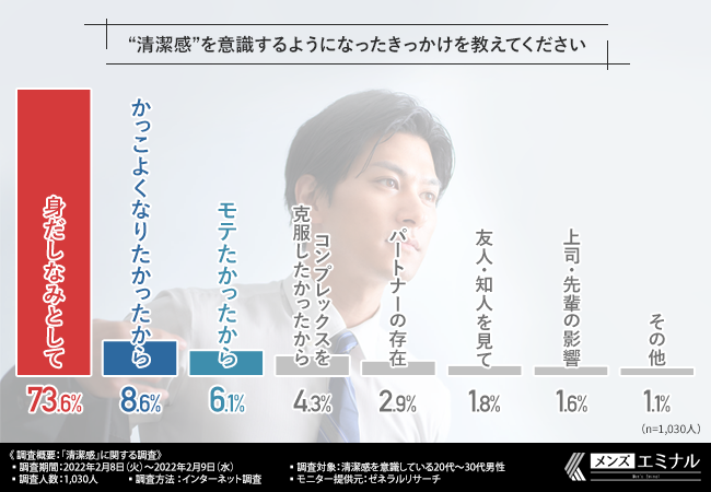そこで、「“清潔感”を意識するようになったきっかけを教えてください」と質問したところ、『身だしなみとして(73.6%)』と回答した方が最も多く、次いで『かっこよくなりたかったから(8.6%)』『モテたかったから(6.1%)』と続きました。