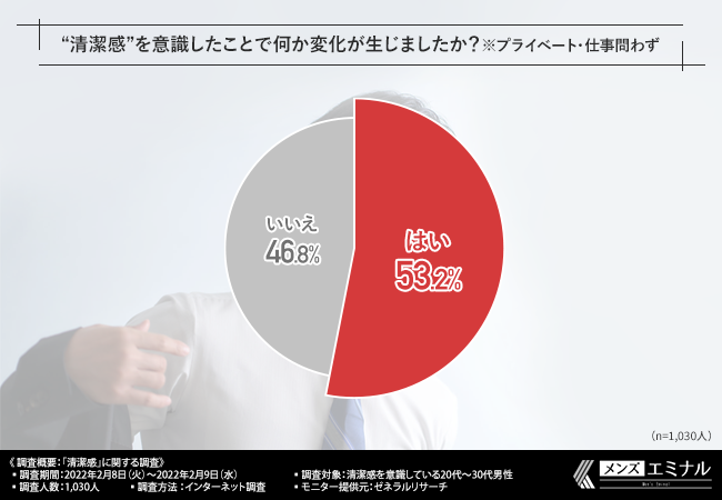 そこで、「“清潔感”を意識したことで何か変化が生じましたか?※プライベート・仕事問わず」と質問したところ、半数以上の方が『はい(53.2%)』と回答しました。