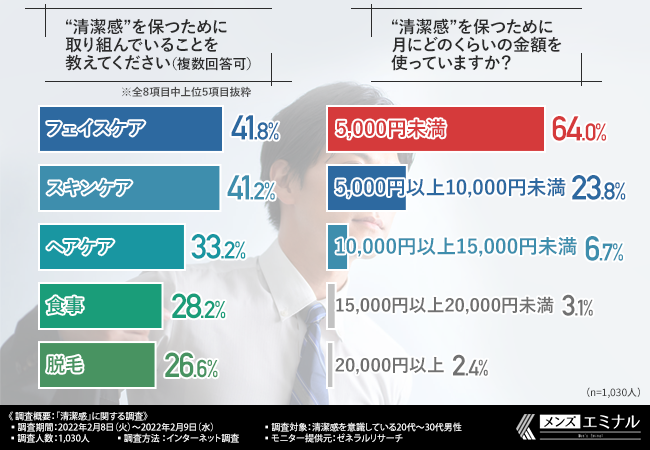 “清潔感”のためにケア用品を購入したり、脱毛などをされている方は施術料を支払ったりと、自己投資も必要になってくるかと思いますが、どのくらいの金額をかけているのでしょうか。
