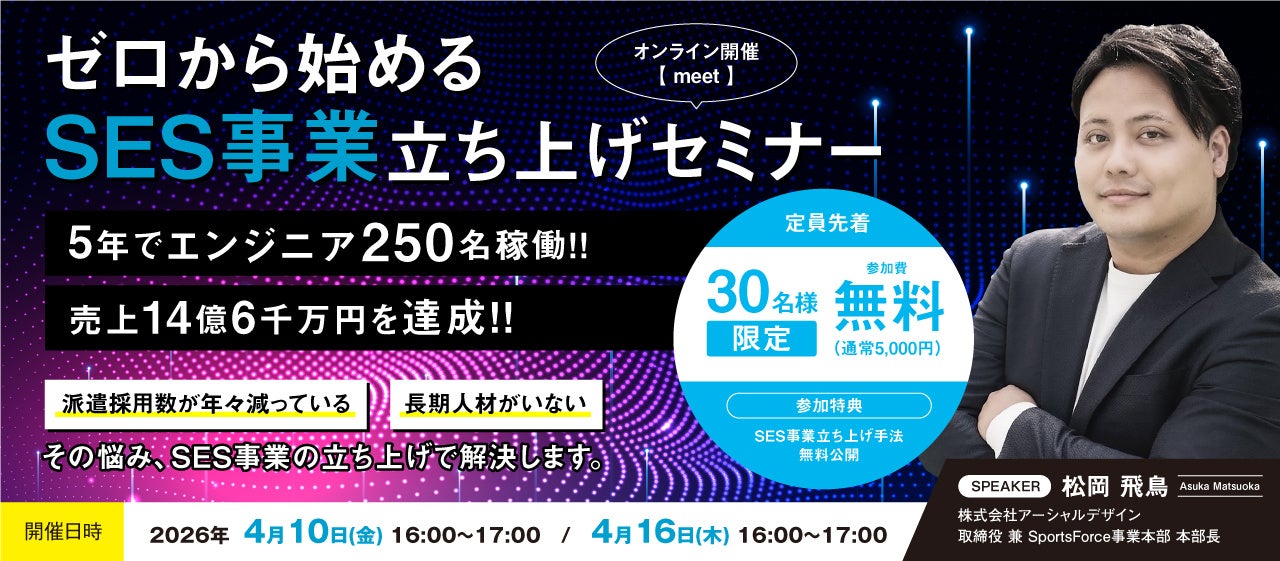 本セミナーは2020年にSES事業を立ち上げた株式会社アーシャルデザインの成功事例をもとに「採用・教育・案件獲得」の各フェーズにおいて、事業を成功に導いた仕組み化を具体的に解説いたします。