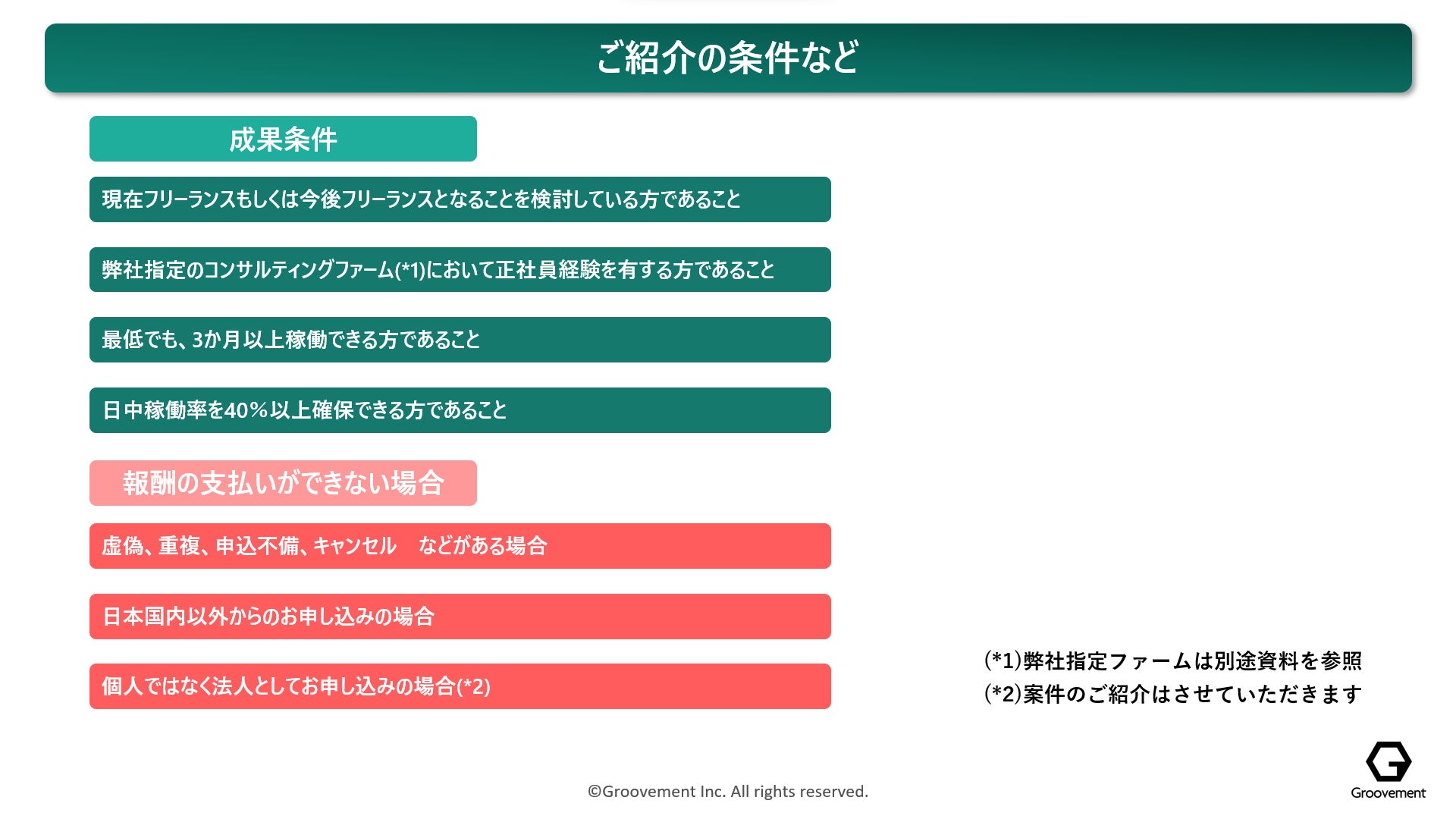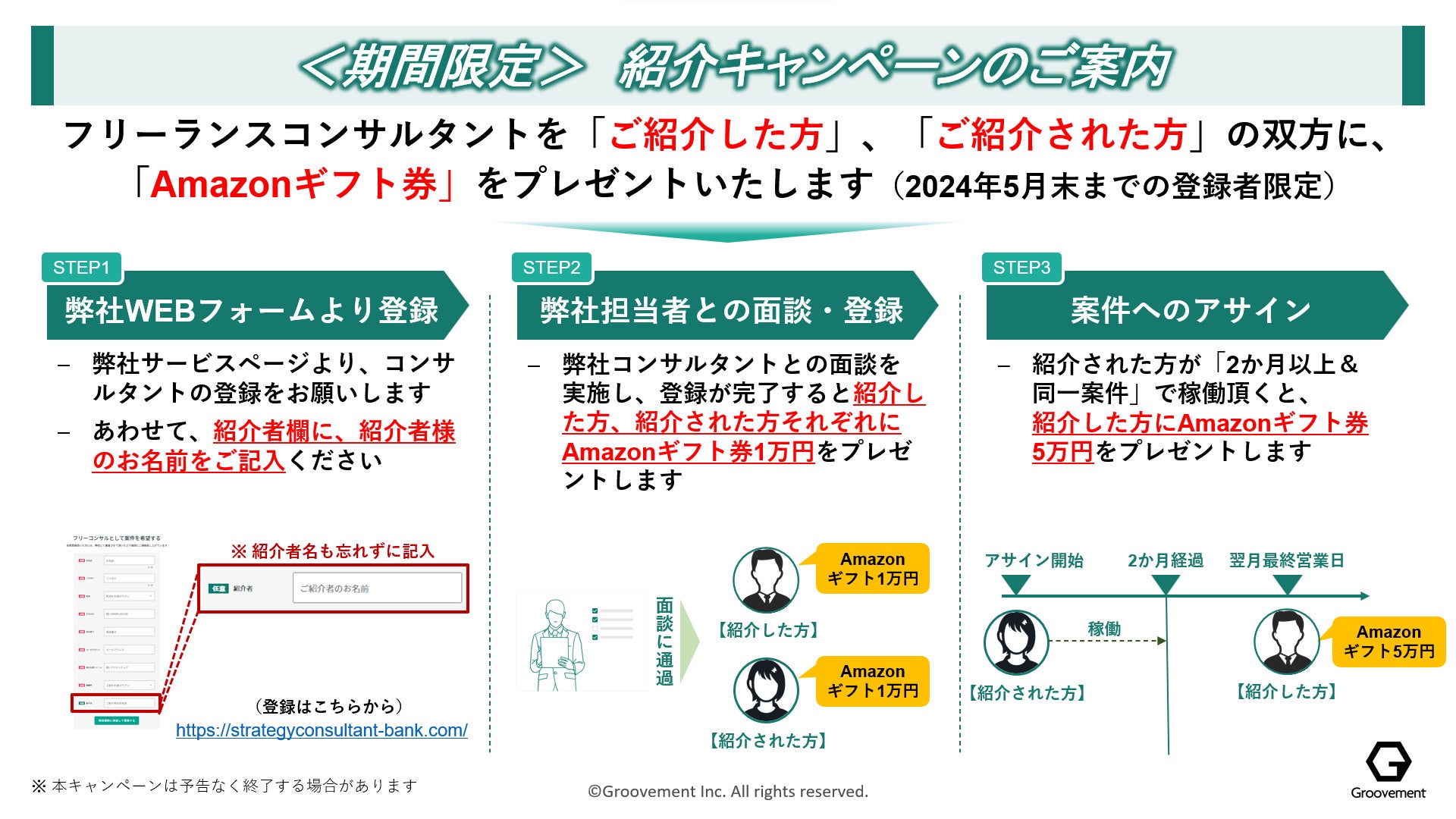 新たな挑戦をするプロフェッショナルを支援する株式会社Groovement(本社:東京都渋谷区、代表取締役:浴野真志)は、フリーランスのコンサルタント向け案件紹介マッチングサービス「Strategy Consultant Bank(SCB)」登録者を対象に、2023年2月29日(木)より「ご友人紹介キャンペーン」を実施いたします。