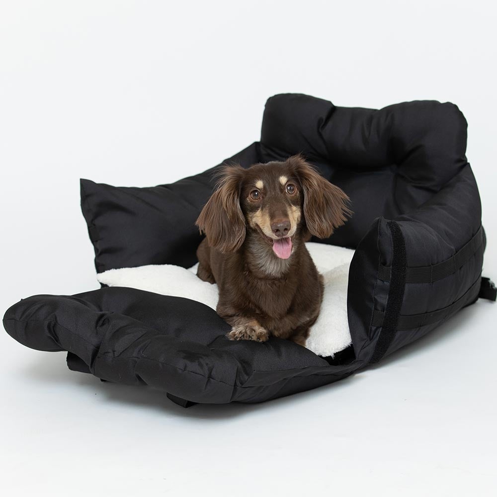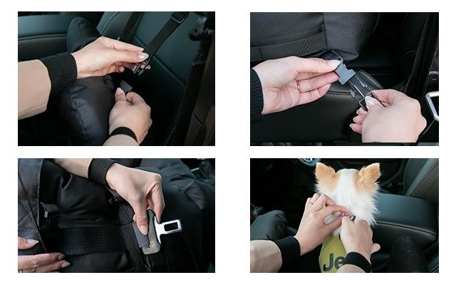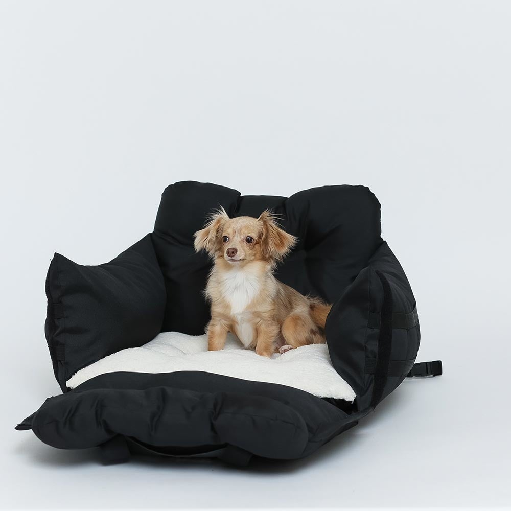 車に乗せるときは、シートベルトと付属ストラップでベッドをシートに固定できます。バッグの内側についている飛び出し防止リードを首輪・ハーネスに取り付けておけば、不意の飛び出しを制限できます。中綿たっぷりふかふかなベッドが衝撃を吸収する役割も果たします。
