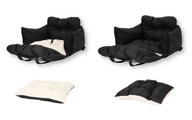 ペット用ドライブキャリーベッドは、ふかふかのベッドとして、ペットを入れたまま持ち手をつかむとキャリーバッグとして、そのまま車のシートに乗せてシートに固定出来ドライブベッドとして使える、とても便利なペット用ベッドです。