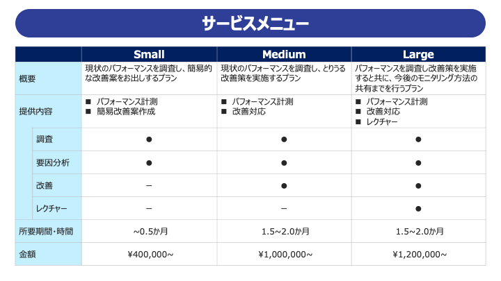 最後に、「Tableauパフォーマンスコンサルティング」サービスの提供内容については、4つのプランをご用意いたしましたので下表にてご紹介します。