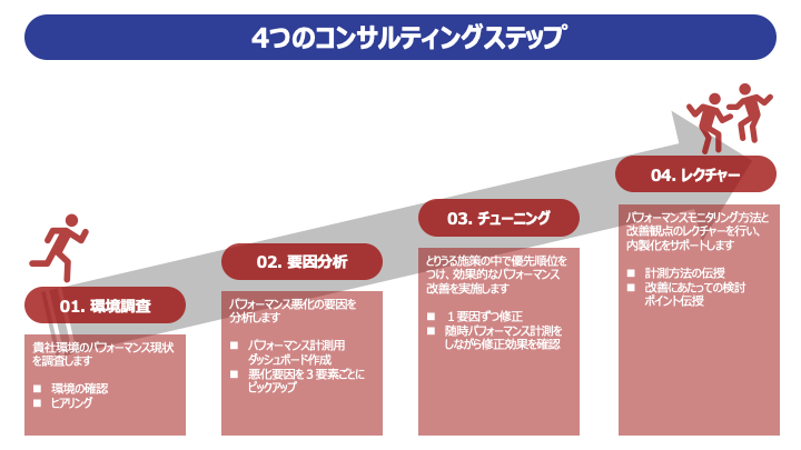 ダッシュボードのパフォーマンスコンサルティングは下図の4つのステップで進めてまいります。
