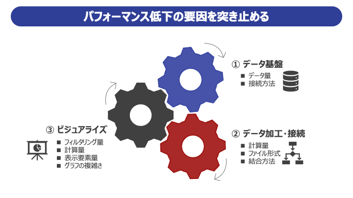 一口にパフォーマンス改善といっても、実際には下図のように要因が大きく3フェーズに分かれており対処法のセオリーがそれぞれございます。