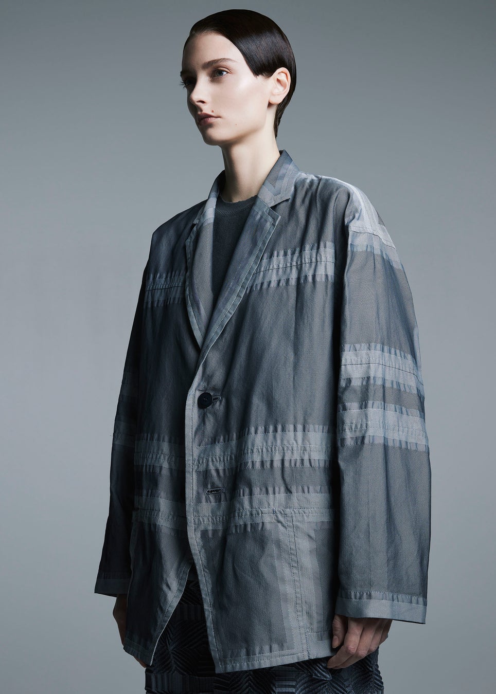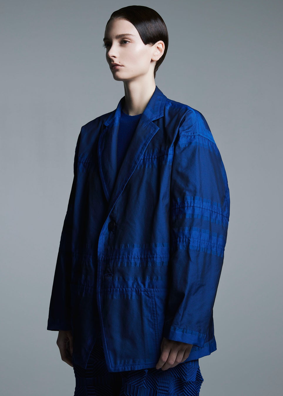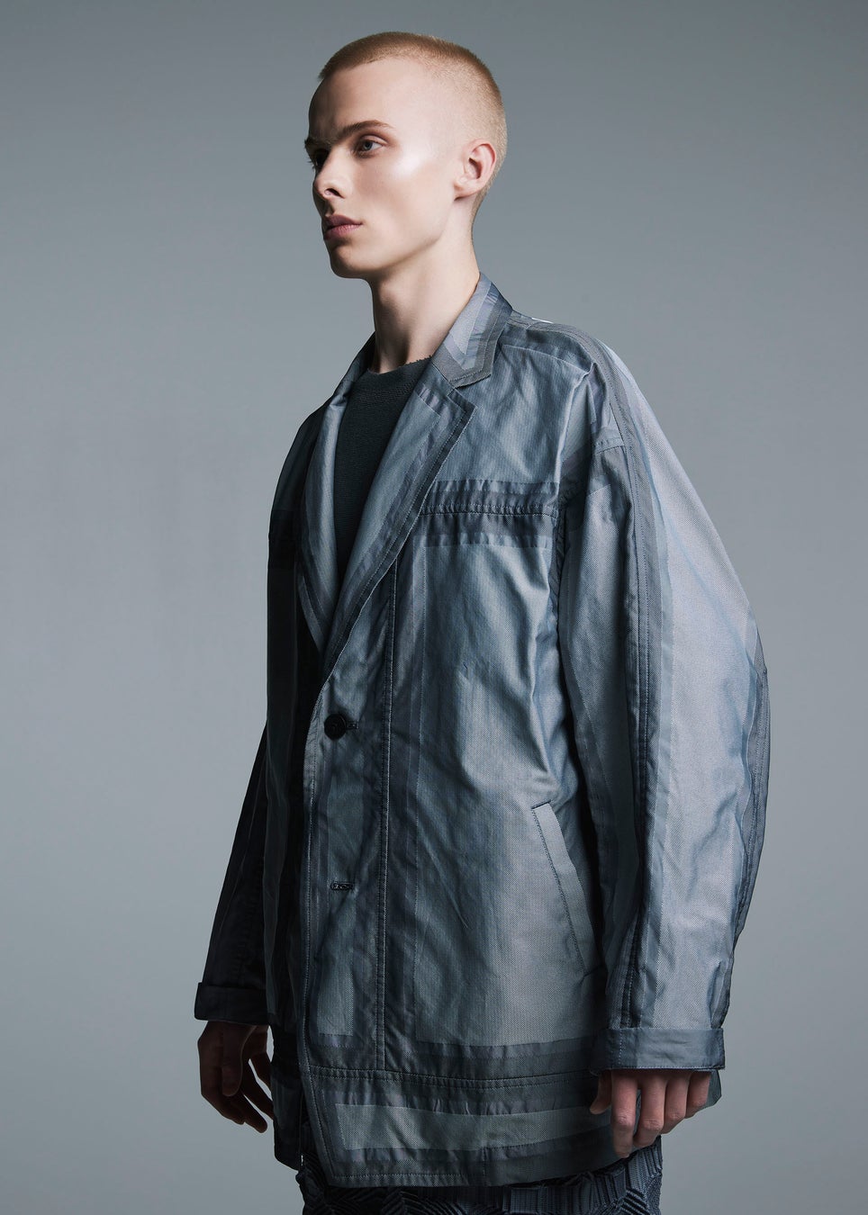 A-POC ABLE ISSEY MIYAKEが独自に開発した形状記憶素材「TYPE-U」のジャケットを原型に、Synfluxが開発・実装する独自のデザインシステム「Algorithmic Couture(アルゴリズミック・クチュール)」を用いた新たなジャケットが誕生しました。アルゴリズムが生み出す膨大なシミュレーションから試行錯誤を経て導き出されたパターンは、生産時の布の廃棄を最少限に抑えるよう、最適な配置でテキスタイルに織り込まれています。合理的で美しく、環境にも着る人にも優しいデザインを探求しました。